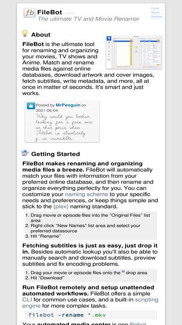 92%filebot is the ultimate tool for organizing and renaming your movies, tv shows and anime as well as fetching subtitles and artwork. it's smart and just works.