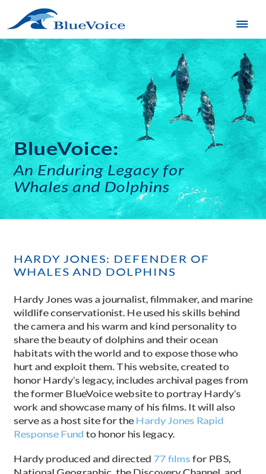 96%bluevoice: an enduring legacy for whales and dolphins. hardy jones was a journalist, filmmaker and marine wildlife conservationist who used his skills behind the camera, along with his warm and kind personality, to expose the world to the beauty of dolphins and their ocean habitats—as well as to expose those who hurt and exploit them.