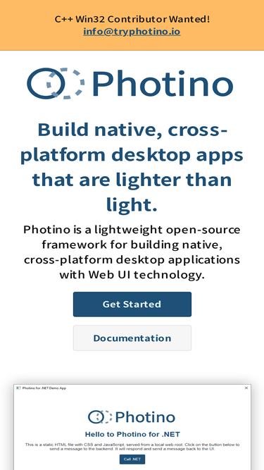 100%Photino is a lightweight open-source framework for building native, cross-platform desktop applications with Web UI technology.