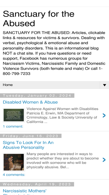 76%SANCTUARY FOR THE ABUSED: Articles, clickable links & resources for victims & survivors. Dealing with verbal, psychological & emotional abuse and personality disorders. This is an informational blog NOT a chat site. If you have questions or need support, Facebook has numerous groups for Narcissism Victims, Narcissistic Family and Domestic Violence Survivors (both female and male) Or call 1-800-799-7233