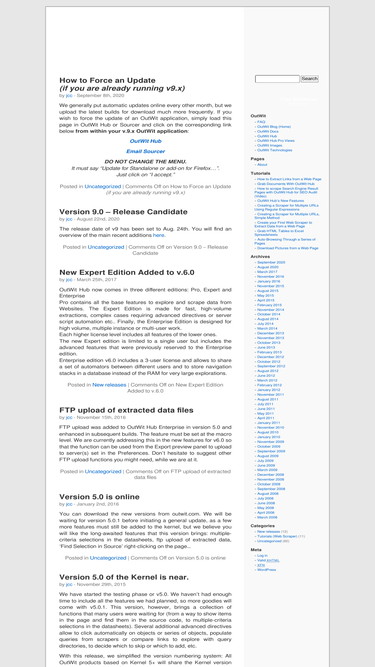 we generally put automatic updates online every other month, but we upload the latest builds for download much more frequently. if you wish to force the update of an outwit application, simply load this page in outwit hub or sourcer and click on the corresponding link below from within your v.9.x outwit application: