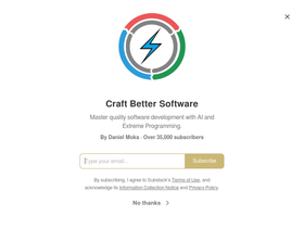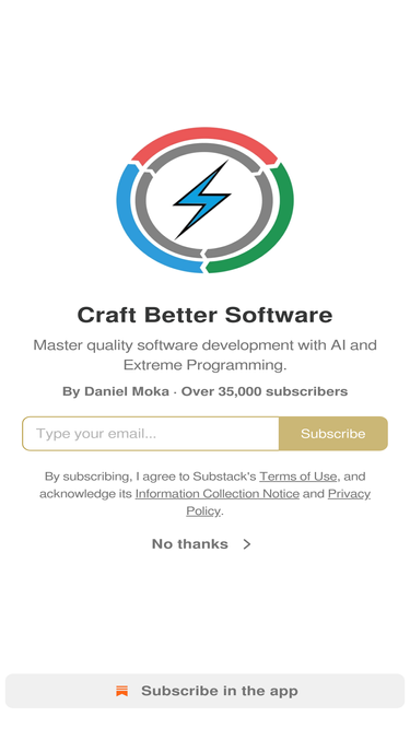 85%Master quality software development with AI and Extreme Programming. Click to read Craft Better Software, by Daniel Moka, a Substack publication with tens of thousands of subscribers.