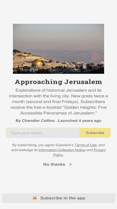 94%Subscribe for free to the Approaching Jerusalem Newsletter and receive the e-booklet Golden Heights: Five Accessible Panoramas of Jerusalem