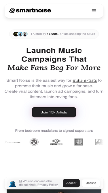 Launch music campaigns that make fans beg for more. Smart Noise is the easiest way for indie artists to promote music, grow Spotify streams, and build a fanbase.