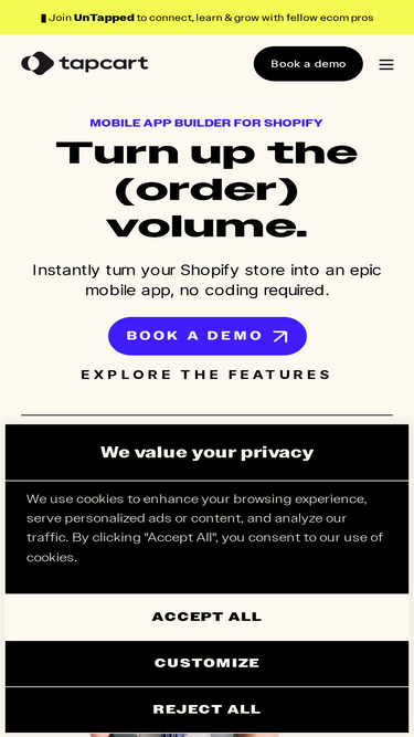 85%Tapcart gives Shopify stores a powerful mobile commerce channel that retains and converts better than web and strengthens customer relationships with personalized, exclusive app experiences. Now powered by Tapcart AI.