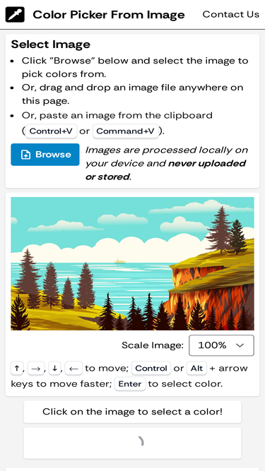 100%A simple tool to pick Hex/RGB/HSL/CMYK colors from an image.