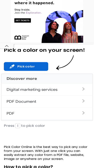 84%Elige cualquier color de una Imagen, Archivo PDF, Sitio web o cualquier lugar en tu pantalla y obtén el código Hexadecimal. ¡Utiliza nuestro Selector de Color Gratis y sin descargar una herramienta!
