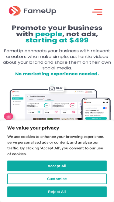 64%FameUp connects you with thousands of local or national brands that will reward you for your social media creativity, when promoting their products &