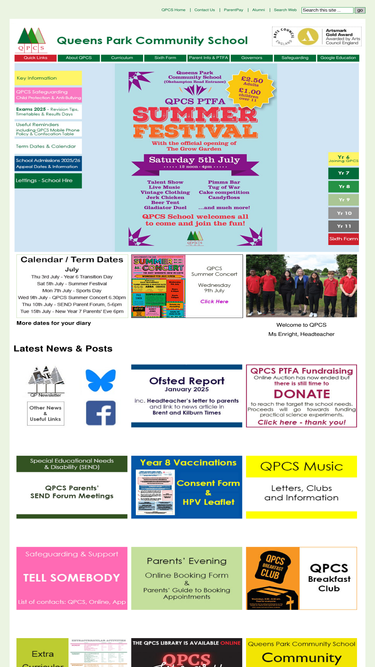 93%queens park community school (commonly abbreviated to qpcs) is a specialist business and enterprise inner city comprehensive secondary school and sixth form in queen's park, north west london, in the borough of brent, uk.