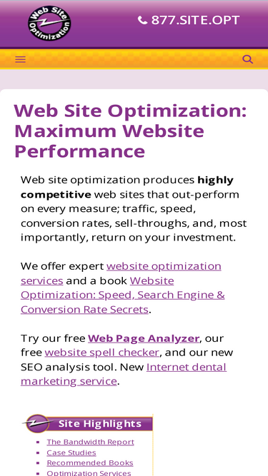 83%Website Optimization Services Maximize Your Profits By Optimizing Your Web Site Website Optimization, LLC is a full-service Web Site Optimization and Internet Marketing firm devoted to increasing your bottom line. Our Website Optimization services are designed to… Increase Speed Boost the download speed of your web pages and accelerate backend systems to retain your visitors ... Read more
