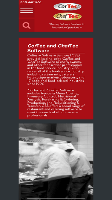 66%culinary software services, makers of cheftec software and cortec software, provides software to chefs, owners, operators, and other foodservice professionals in the food service industry. css serves a vast cross section of the foodservice industry including restaurants, caterers, hotels, motels, multi-unit foodservice operations, educators and many others. css, with their award-winning cheftec and cortec software, is the leader in recipe & menu costing and inventory control software, as well as nutritional analysis software. in addition, we have a broad range of restaurant software programs to suit the needs of chefs, restaurants and other foodservice establishments.
