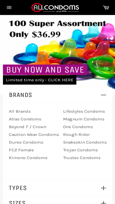 74%Online condom stores are by far the easiest and cheapest way to buy condoms online. But you should really pay attention to the condom store you are shopping with. If their price is too low or they have no business history, there's a good chance you are buying condoms from someone selling cheap or counterfeit seconds. All condoms has been selling condoms online since 1996. We have satisfied hundreds of thousands of customers over the past two decades! Purchase from a condom store you can trust. At All condoms our customers come first! Our speedy delivery and 100% money-back guarantee help make All condoms the clear choice. Buy condoms online that are new, not used, old or near expired. All packaging and billing is totally discreet and confidential with no mention of the word condom on the package or credit card statement! Your secret is safe with us, all credit card statements will read ACS Group so no-one but you will know what you ordered. We take pride in our customers and we value your privacy. Shipping is totally discreet too, nothing on the package will let anyone know what you ordered, not even your postman will know what's in the package. If your're looking for good quality condoms at a great price, then we encourage you to buy your condoms online from the condom store you can trust - All condoms. All Condoms Online Condom Store selling all brands and styles of condoms, great service, low prices, fast and discreet delivery. 2112 Sunnydale Blvd Clearwater Florida, 33765 United States