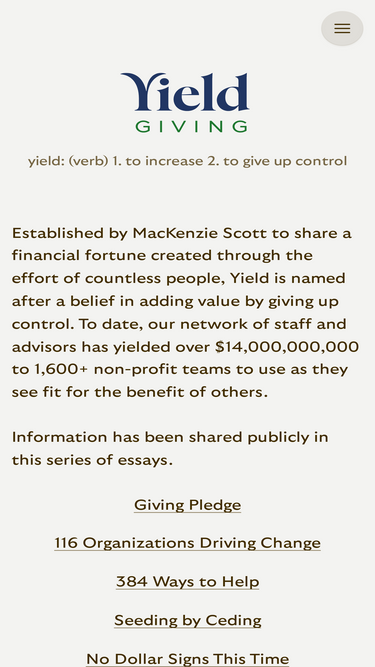 100%Established by MacKenzie Scott to share a financial fortune created through the effort of countless people, Yield is named after a belief in adding value…