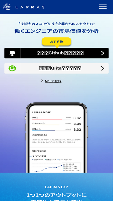 83%LAPRASは機械学習技術によるスコアリングで自分の技術力や市場価値を測れる「プロフィール」を自動生成。スタートアップなど厳選企業から転職・副業のスカウトも。
