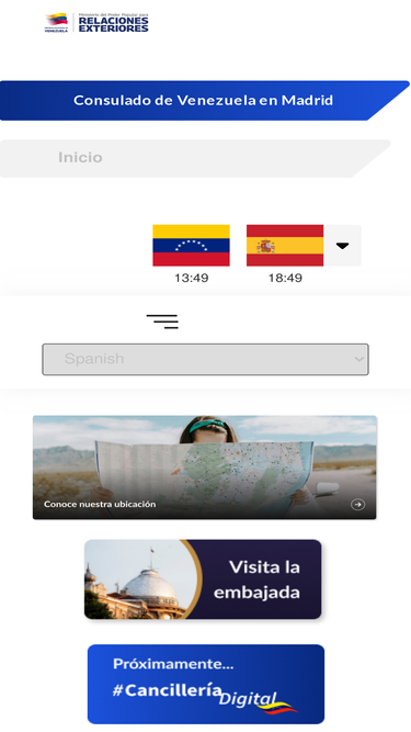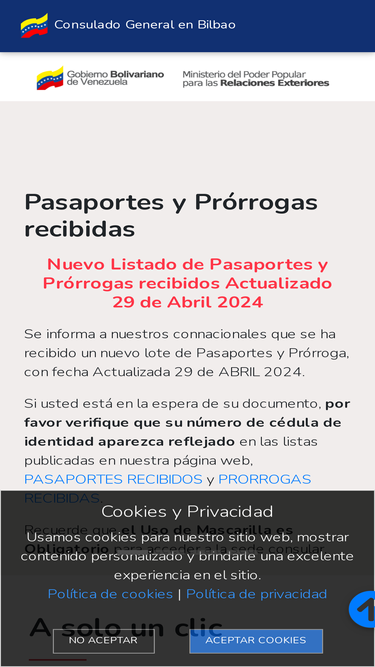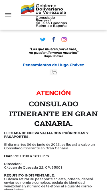 Ir al sitio Legalización y apostilla Trámites a venezolanos Ir al sitio Ir al sitio Atención priorizada Ir al sitio Repatriaciones nacionales Trámites consulares más comunes Ver más trámites Visas Fe de vida Pasaporte Certificados Constancia Registro Actos notariales Registro consular Mensajes oficiales Comunicados Ver más Discursos Ver más Tipos de trámites de repatriaciones Ver más trámites Redes Sociales