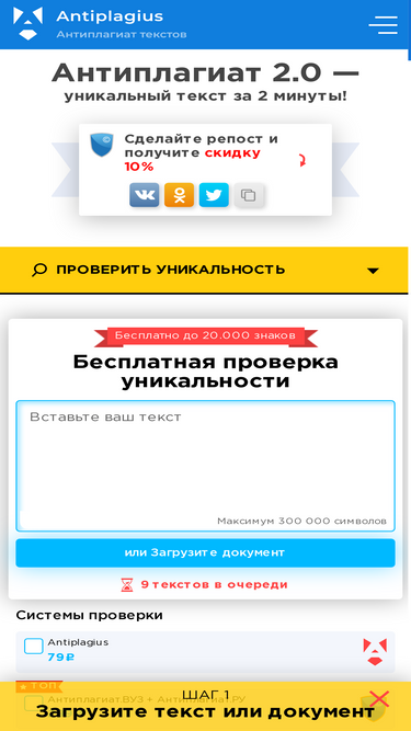 90%бесплатный онлайн-сервис для проверки текстов и документов на уникальность — antiplagius.ru. ➜ вставьте текст и получите процент его уникальности без регистрации. ✓ наша уникальная система позволяет проверить на антиплагиат, а также получить уникальный текст за 2 минуты!