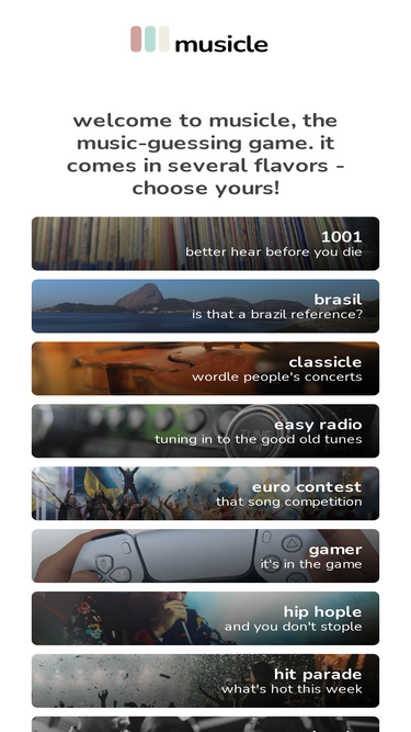 Bandle is the daily music guessing game where you guess the song with the fewest instruments. Play the latest songs for free, themed packs and bonus rounds on web or mobile.