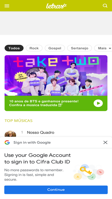 72%O site de música mais acessado pelos brasileiros oferece letras, traduções, cifras e o melhor player para ouvir músicas e assistir clipes com legenda.