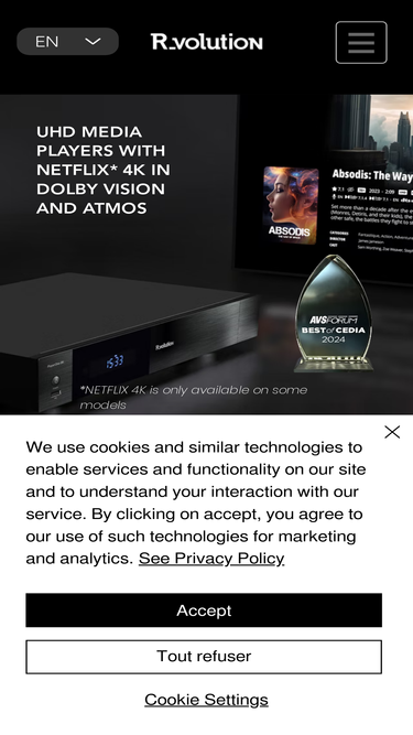 81%The R_volution PlayerOne is a new 4K media player compatible with Dolby Vision and HDR10+ powered by the latest Realtek RTD1619DR chipset. It includes R_video, a modern and fast Media Center app to manage your video file collection.
