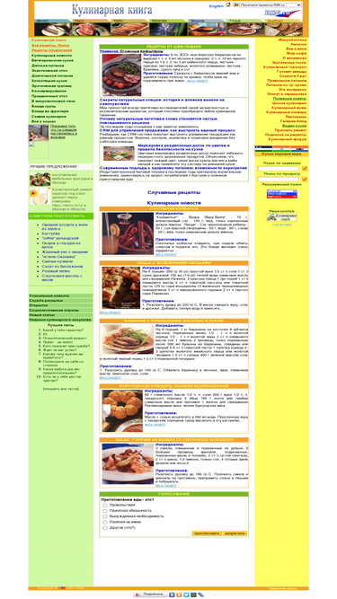 91%16000 кулинарных рецептов с удобным поиском по разделам и продуктам. диетические, детские, вегетарианские, эротические блюда, национальные кухни. статьи об этикете, сервировке, напитках, витаминах, правильном питании, советы, тосты, гороскопы, юмор.