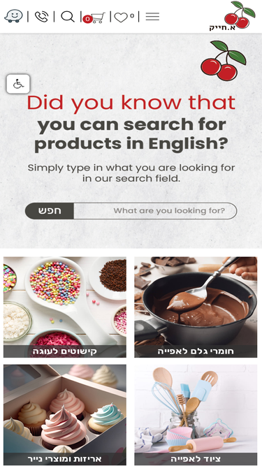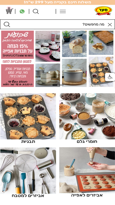81%סער מוצרים לאפייה - משלוח חינם בקנייה מעל 299 ש"ח! חנות האפייה עם המגוון הגדול ביותר של אביזרי אפייה וציוד אפייה. צרו קשר: 04-6212674 מגוון ענק של חומרי גלם: מקלות וניל, צימקאו, בצק סוכר, רינגים לאפייה, תבניות לאפייה ועוד.