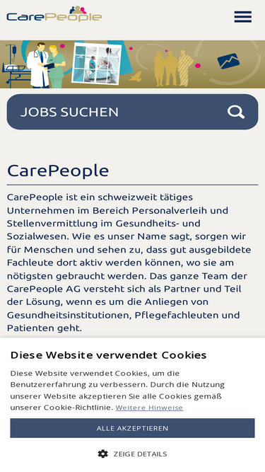 94%carepeople ist ein aufstrebendes unternehmen im bereich privatpflege, personalverleih und stellenvermittlung im gesundheits- und sozialwesen. wie es unser name sagt, sorgen wir für menschen und sehen zu, dass gut ausgebildete fachleute dort aktiv werden können, wo sie am nötigsten gebraucht werden. wir bringen farbe, leben und freude ins leben unserer patienten, kunden und stellensuchenden. das ganze team der carepeople ag versteht sich als partner und teil der lösung, wenn es um die anliegen von gesundheitsinstitutionen, pflegefachleuten und patienten geht.
