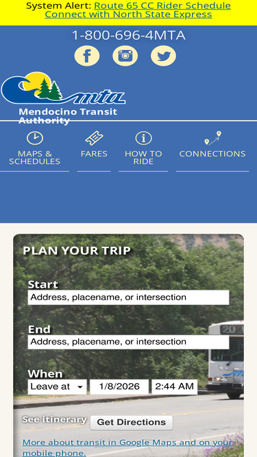 92%mendocino county, california. mta’s service area encompasses about 2,800 square miles including the mendocino coast and inland communities. the transit system includes a network of long distance, commute and local fixed routes, plus dial-a-ride services in ukiah and ft. bragg. mta provides service throughout the county, including the communities of albion, anchor bay, bodega, bodega bay, boonville, calpella, caspar, elk, fort bragg, fort ross, freestone, gualala, hopland, jenner, manchester, mendocino, navarro, philo, point arena, redwood valley, santa rosa, sea ranch, stewarts point, ukiah, willits, and windsor.