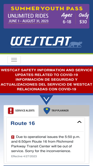 88%westcat is a public transportation service in western contra costa county.the western contra costa county transit was established in august 1977 as a joint exercise of powers agreement between contra costa county and the cities of hercules and pinole.