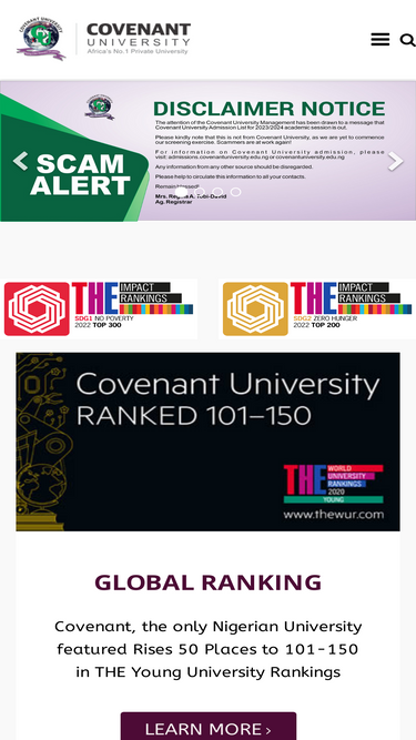 100%covenant university is a growing, dynamic vision-driven university, founded on a christian mission ethos and committed to pioneering excellence at the cutting edge of learning. we run with a compelling vision of raising a new generation of leaders for the african continent. we are doing this on a holistic, human development and integrated learning curriculum to raise total men and women who will develop their world.