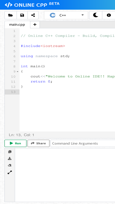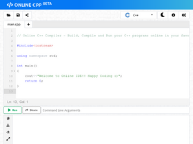 build and run your code instantly. onlinecpp is a quick and easy tool that helps you to build, compile, test your programs online.
