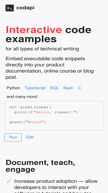 88%Embed executable code snippets directly into your product documentation, online course or blog post.