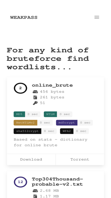 92%discover a vast collection of password dictionaries and wordlists at weakpass.com. whether you're a security researcher, ethical hacker, or penetration tester, find the tools you need to perform comprehensive password cracking and security assessments. stay ahead in cybersecurity with regularly updated wordlists optimized for various password recovery tools.