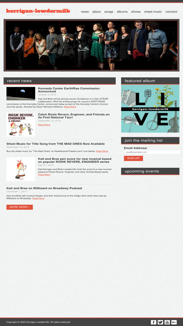 82%kait kerrigan (words) and bree lowdermilk (music) made their off-broadway debut in 2006 with their adaptation of henry and mudge, still touring nationally. in 2011, they released their first album our first mistake, which charted at #1 on the itunes singer/songwriter chart.