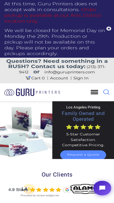 91%Retractable Banners Los Angeles Retractable banners Los Angeles with banner stands are printed in full color. They are printed on one side of Matte Banner material. If you are looking for more information about how to design a retractable banner stand, please view our FAQ section. Looking to see what our clients are saying about our retractable banner printing services? Check out our yelp reviews here. Guru Printers offers same-day banner printing! Cut off time is 8 AM PST. Retractable banners: The banner stands are lightweight and easy to carry to trade shows and events. Nylon carrying case for the pop up banner is included. We print retractable banners on a high quality printer. Our retractable banners include both the banner stand and the print. Banner Stands are easy to set up. Economical Display Retractable Banner: This 33″ wide banner display stand is lightweight and portable. When not in use, your banner is stored inside the anodized aluminum casing which fits easily into the travel bag (included). Banner width: 33″ Banner height: 78″ Premium Display Retractable Banner: This 36″ wide banner display stand features a sleek design with polished ends. The wide base design gives a professional look while providing excellent stability. The banner display stand holds a banner up to 36″ in width and a fixed height of 90″. You can change banners in minutes. When not in use, your banner graphic is stored inside the anodized aluminum casing which fits easily into the travel bag (included). Banner Sign Width: 36″ Banner Sign Height: 90″ Wide Banner Display: Banner Signage Width: 47″ Banner Signage Height: 80″ Retractable Banners Los Angeles: Banner stands draw attention in any venue. Banner Stands draw the eye on a packed tradeshow floor, create an awesome photo op at a personal event, or use banners to advertise products in your store. The variety of banners available from Guru Printers fits the variety of uses they have! Retractable b