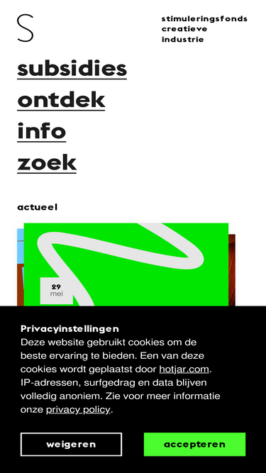 76%Het Stimuleringsfonds Creatieve Industrie is het cultuurfonds voor vormgeving, architectuur, digitale cultuur en de cross-overs daartussen. Als een van de zes Nederlandse rijkscultuurfondsen financieren we bijzondere en vernieuwende projecten, onderzoek en activiteiten van ontwerpers, makers en culturele instellingen in de creatieve industrie.