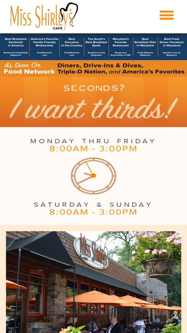 100%Miss Shirley's Cafe offers our guests an exceptional award winning culinary experience for breakfast, brunch and lunch. Our specialties are rooted in Southern fundamentals and the abundance of fresh ingredients from the Chesapeake Bay region of Maryland. We pride ourselves in beautifully presented plates, prompt and professional service, as well as clean, comfortable and well-maintained premises for our guests.