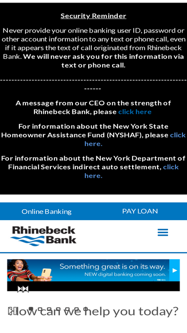 62%rhinebeck bank, your community bank. from your banking needs to our community, see all that we have to offer. view options.