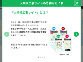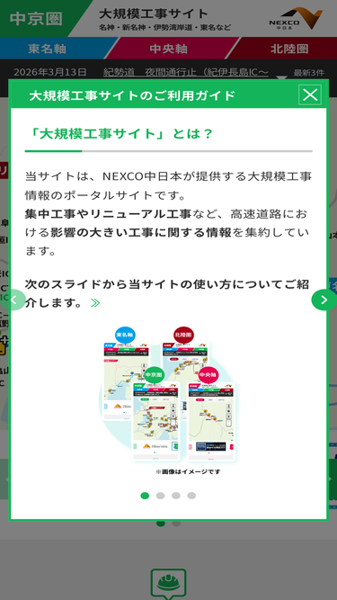 NEXCO 中日本(中日本高速道路)公式サイトの、大規模工事情報ページ。名神・新名神・伊勢湾岸道・東名など、中京圏における区間別の工事情報や安全なご利用、工事規制手順などをご案内しています。