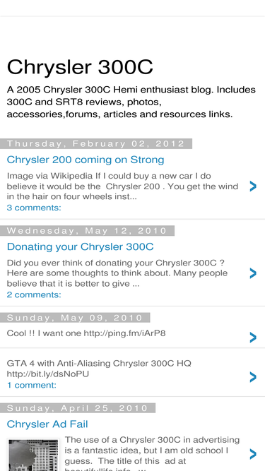 100%a 2005 chrysler 300c hemi enthusiast blog. includes 300c and srt8 reviews, photos, accessories,forums, articles and resources links.