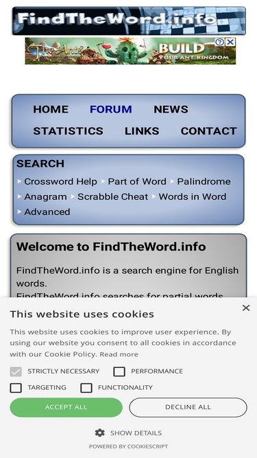 75%findtheword.info is a search engine for english words. findtheword.info searches for partial words (both crossword solver and part of word), help with cheating in scrabble and wordfeud, finds anagrams, palindromes, and words in word, and much more.the dictionary used contains more than 936,000 english words.
