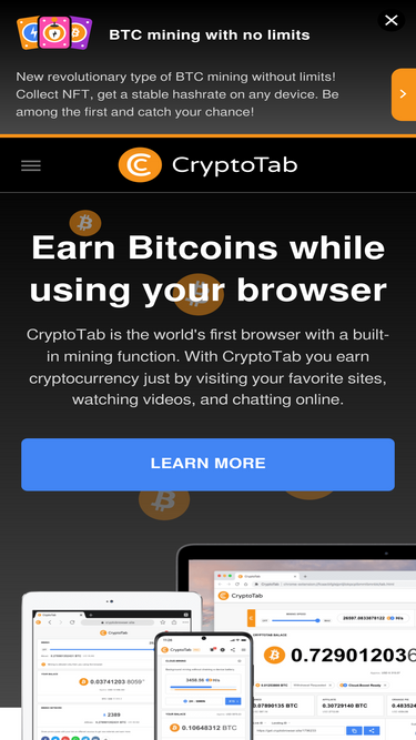 89%Попробуйте CryptoTab — первый в мире браузер с функцией майнинга. Зарабатывайте BTC, не отрываясь от просмотра видео, общения в сети и онлайн-игр. Присоединяйтесь к сообществу из более чем 35 миллионов пользователей по всему миру, уже пользующихся браузером CryptoTab.