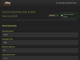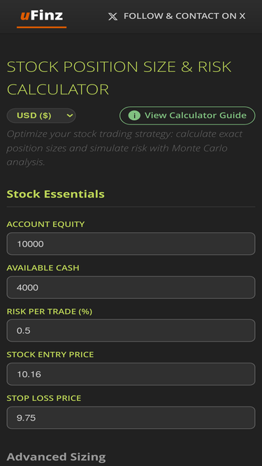 Free stock position size calculator and risk management tool. Calculate shares to buy, capital exposure, and run Monte Carlo simulations for stock trading.