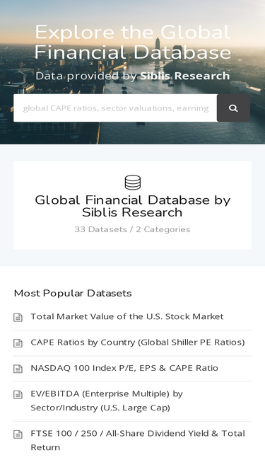85%▹ Global Equity Valuations Database by Siblis Research provides you key valuation metrics of all the major stock markets & economies in the world. This Professional Subscription Plan to the dat…
