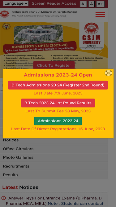 98%welcome to the website of chhatrapati shahu ji maharaj university, kanpur formerly known as kanpur university, kanpur. the university is awarded a++, the highest rating by naac,here you can find out the information about admissions, results, upcoming events, notices, about various departments of university, syllabus etc.