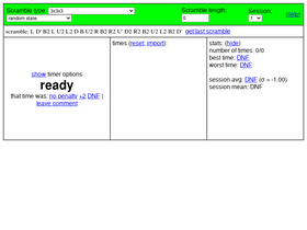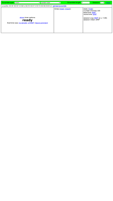 100%online javascript timer for timing your rubik's cube solves. includes statistics, timing breakdowns, random-state scrambles, scramble images and scrambles for 2x22x to 7x7x7, megaminx, pyraminx and square-1.