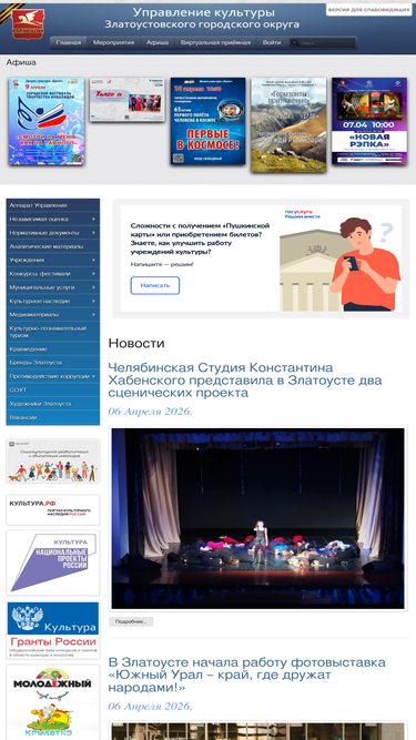89%добро пожаловать на сайт управления культуры города златоуста. новости, афиша, мероприятия. аппарат управления. учреждения. нормативные документы.