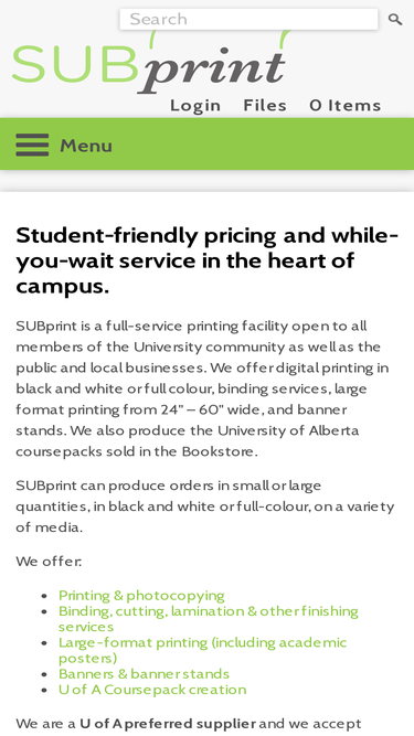 75%subprint@su.ualberta.ca - subprint is a full-service printing facility located at the university of alberta, offering same-day and 'while you wait' service. subprint can produce any document you require, in small or large quantities, in black and white or full-colour, on a variety of media, including large-format printing.