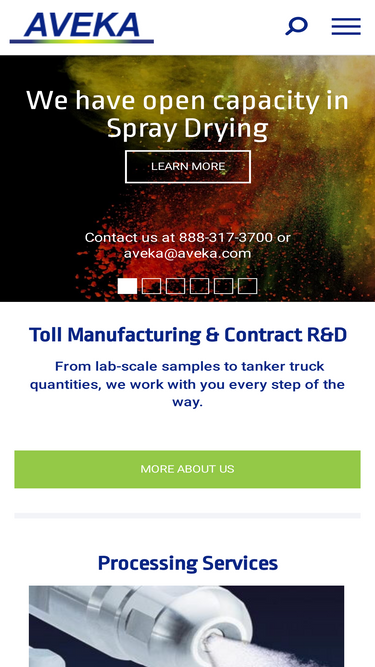 Spray drying is a process that involves rapidly drying solutions or slurries by atomizing them in a heated chamber. From lab-scale experiments to large-scale manufacturing, AVEKA offers a range of services, whether you need to process food-grade materials like proteins and starch or industrial materials such as polymers and ceramics.