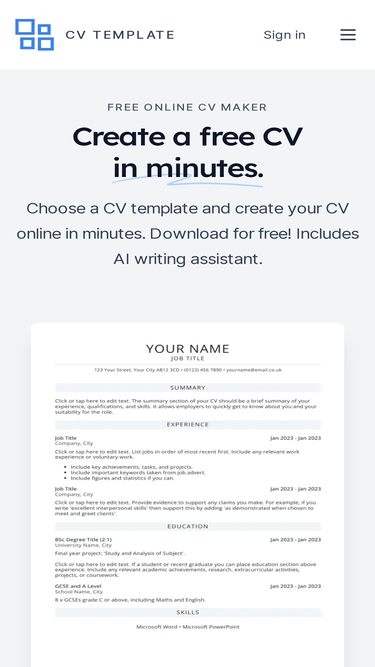Free online CV maker. Choose a CV template and create your CV online in minutes. Download for free! Includes AI writing assistant that can help write your CV.
