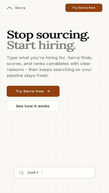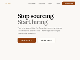 70%Serra is an AI recruiter that fully automates candidate sourcing and outreach. Companies hiring Serra skip sourcing entirely and simply get qualified interviews on their calendar.